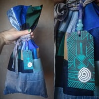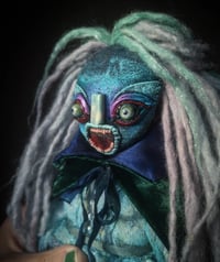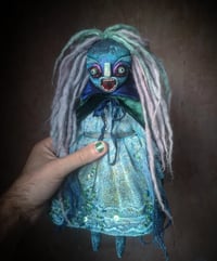 Handmade fabric art doll with fabric sculpted and handpainted details, distressed cheesecloth and scrim dress, glass bead eyes, cotton velvet cloak, wool roving hair with beaded and sequin details.