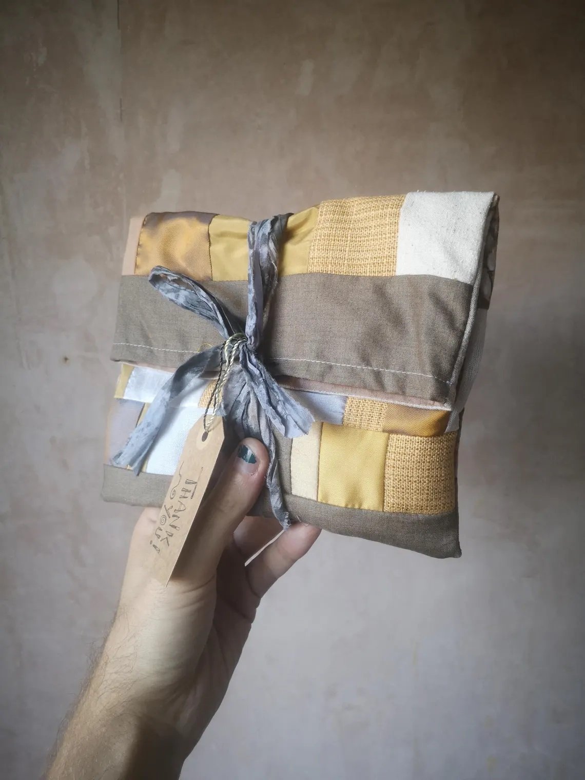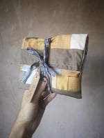 Comes in a lined patchwork fabric bag, with label and sari silk ribbon.