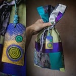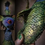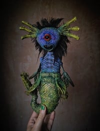 Handmade fabric art doll with fabric sculpted and handpainted details, imitation fishscaled tail, glass bead eyes, gloss varnished details.