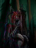 Throne is complete with blood red velvet cushion, flock and textured effect and ribbon/beads as well as vintage black netting.