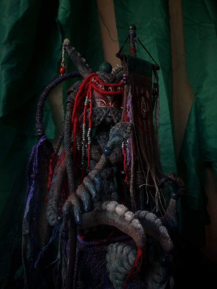 Comes with throne and textile banner. Doll is not fixed to stand and can be removed. She is wired and has a complex stuffed body constructed from lots of individual shapes.