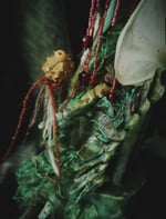 Handpainted fabrics, found and vintage elements, recycled and reused trimmings, wool dreads and elaborate headdress. Heavily textured and varnished finish with beading. Stand is a solid slice of holly trunk, with additional wooden, bone and fabric sculpted elements.