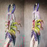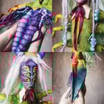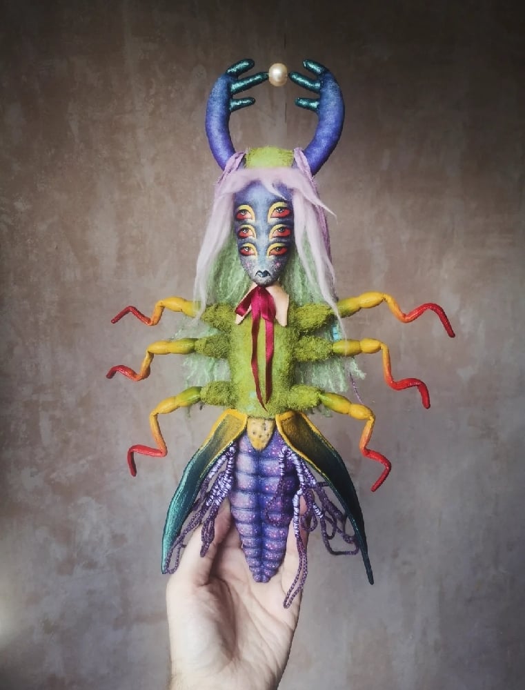 Experimental textile art doll made with recycled/reused textiles including calico, viscose fur, handpainted face and sculpted details. Yarn and wool roving hair, metallic details with matte/gloss finish, beads and silk ribbons.