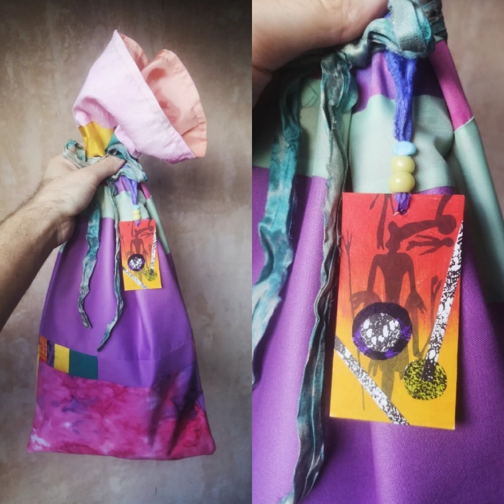 Comes in patchwork fabric bag with ribbon and label.