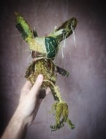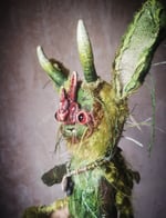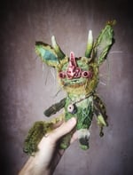 Handmade fabric art doll with fabric sculpted and handpainted details, single horn and mismatched stitching, staining, loose threads etc. Stuffed using scrap fabrics and recycled wool.