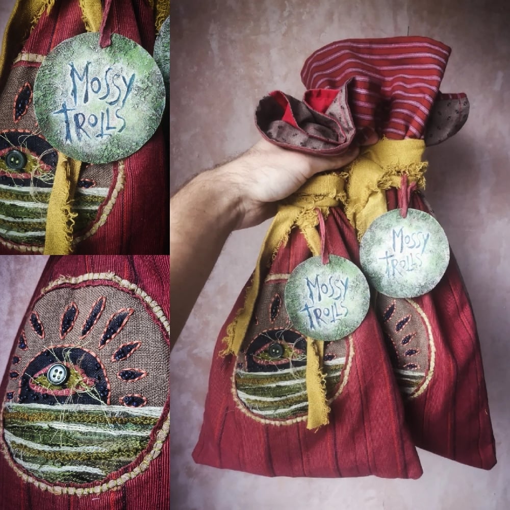 Comes in a cloth bag made from recycled materials with collaged fabric/beaded detail, with label and sari silk ribbon.
